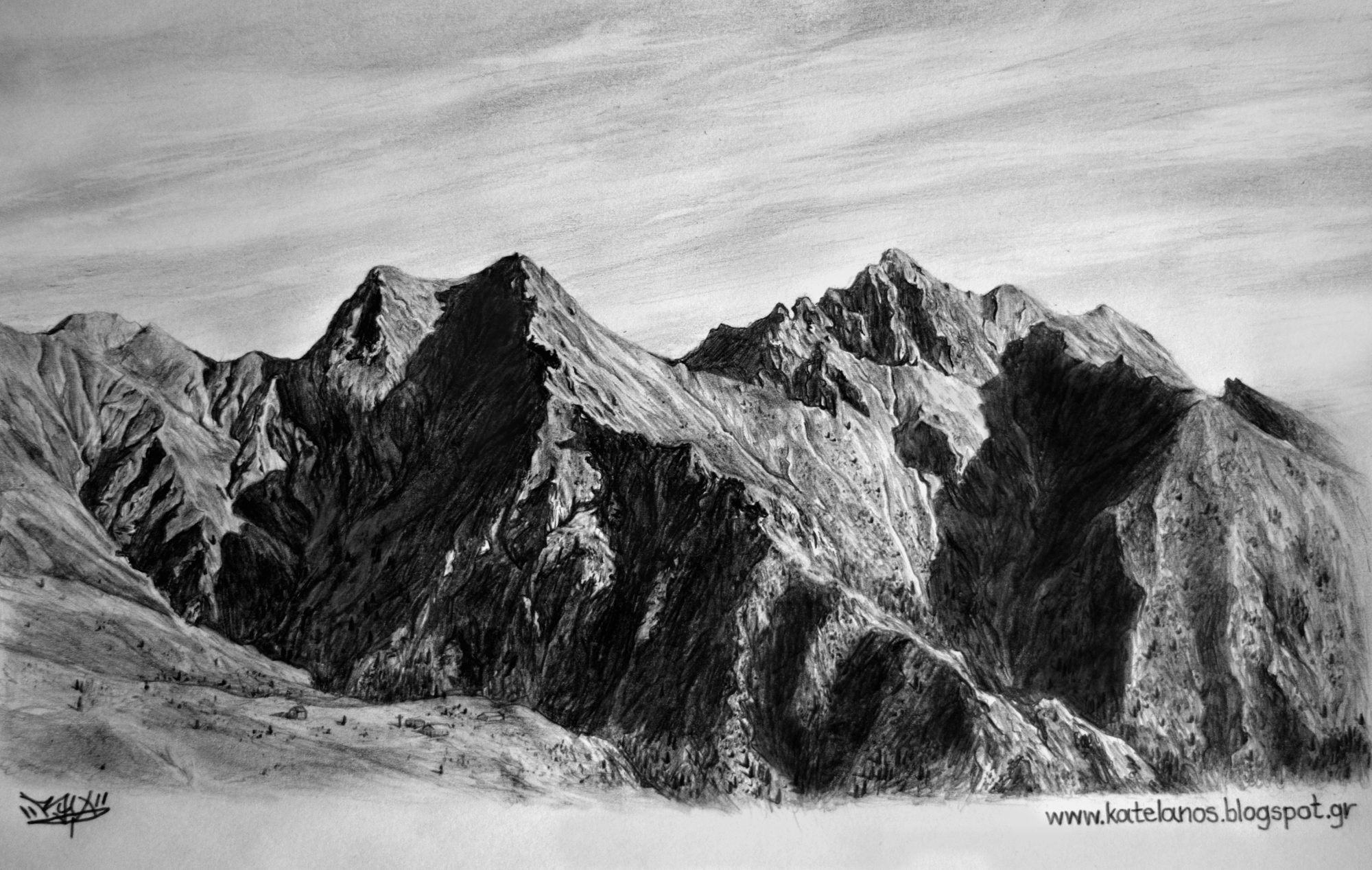 | Οι κορφές όπως φαίνονται από τη Νιάλα. Έργο ζωγραφικής του Χ. Παρθένη (RAW ART) |